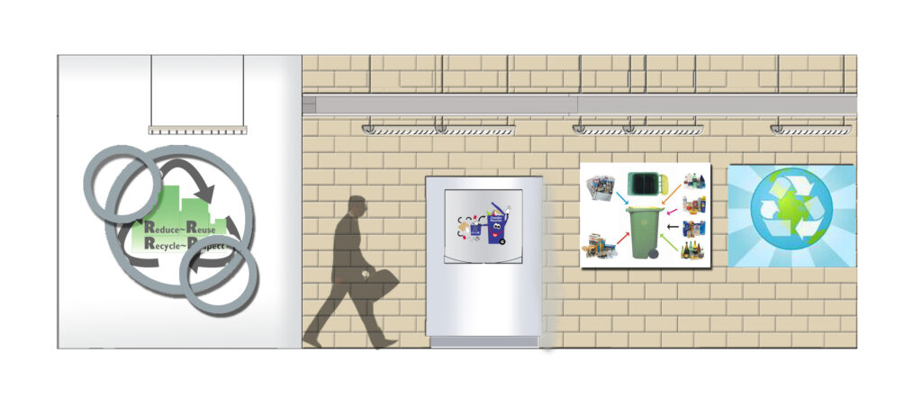 This space was designed to celebrate every scale of recycled waste by utilizing materials all the way from everyday glass bottles to massive structural I-beams.
