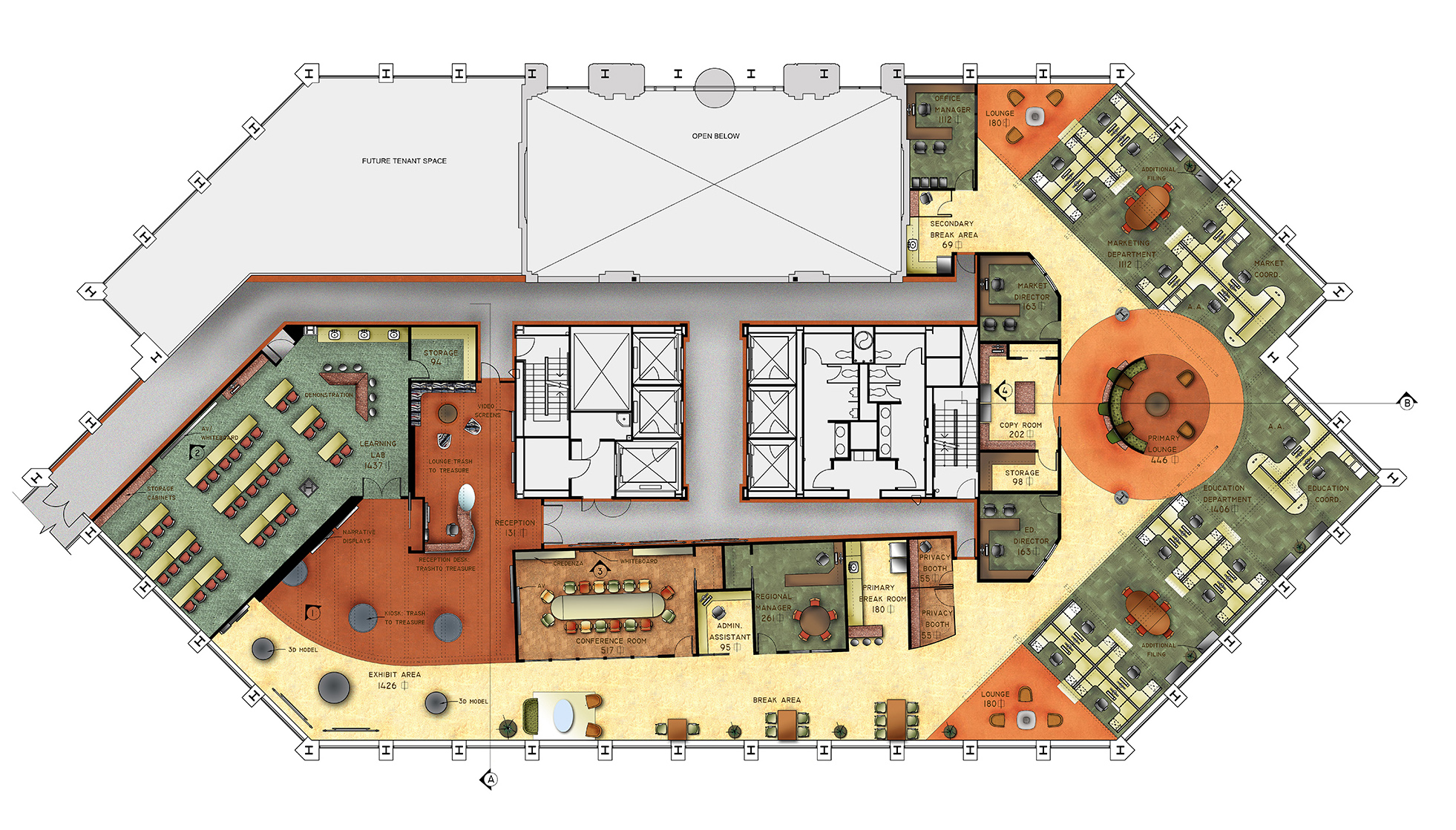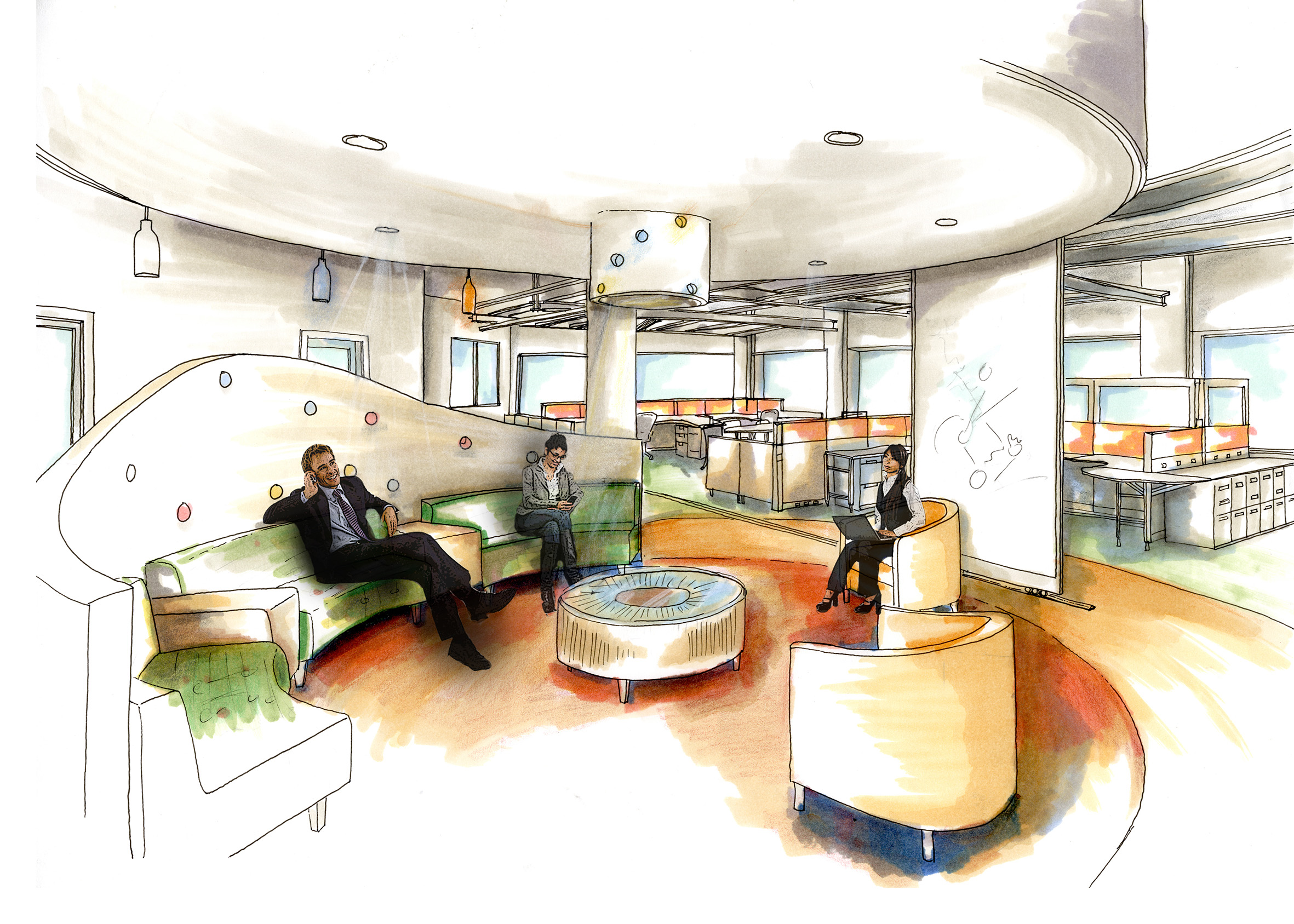 The organization of the office utilizes the grid set up by the columns while balancing this heavy repetition with soft curves and more organic material choices.