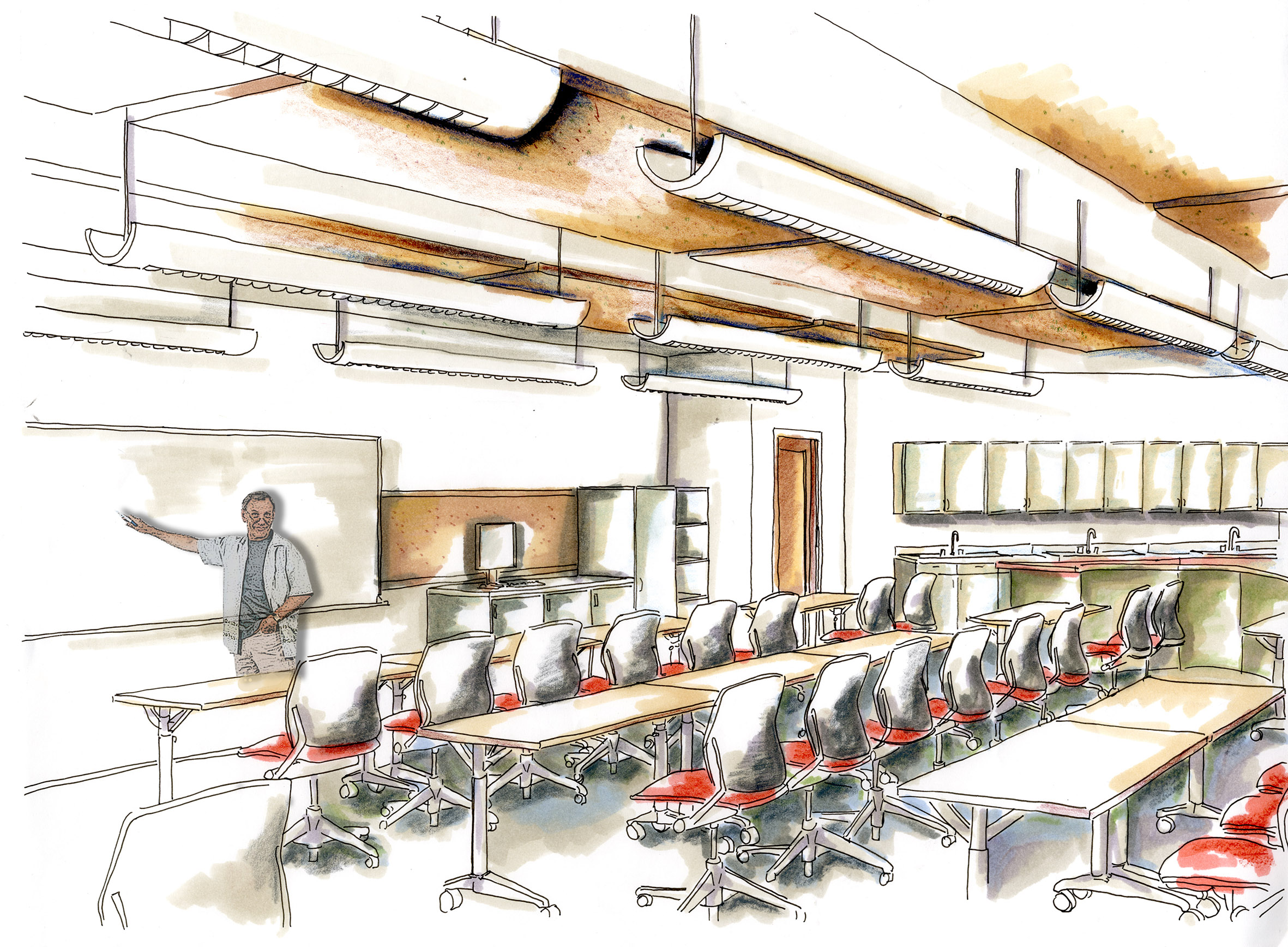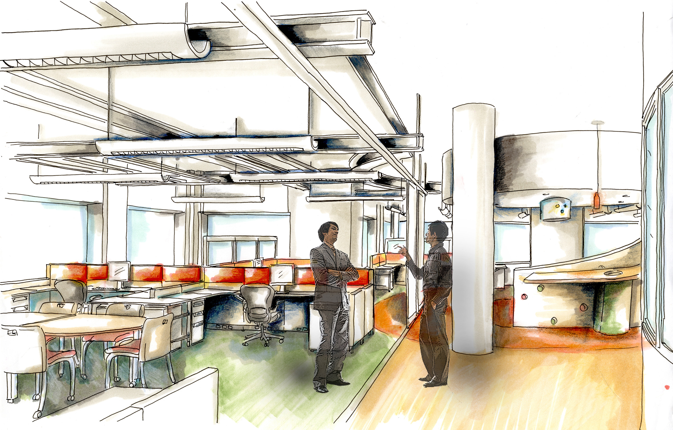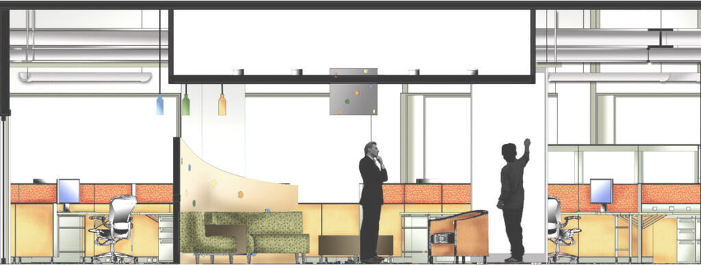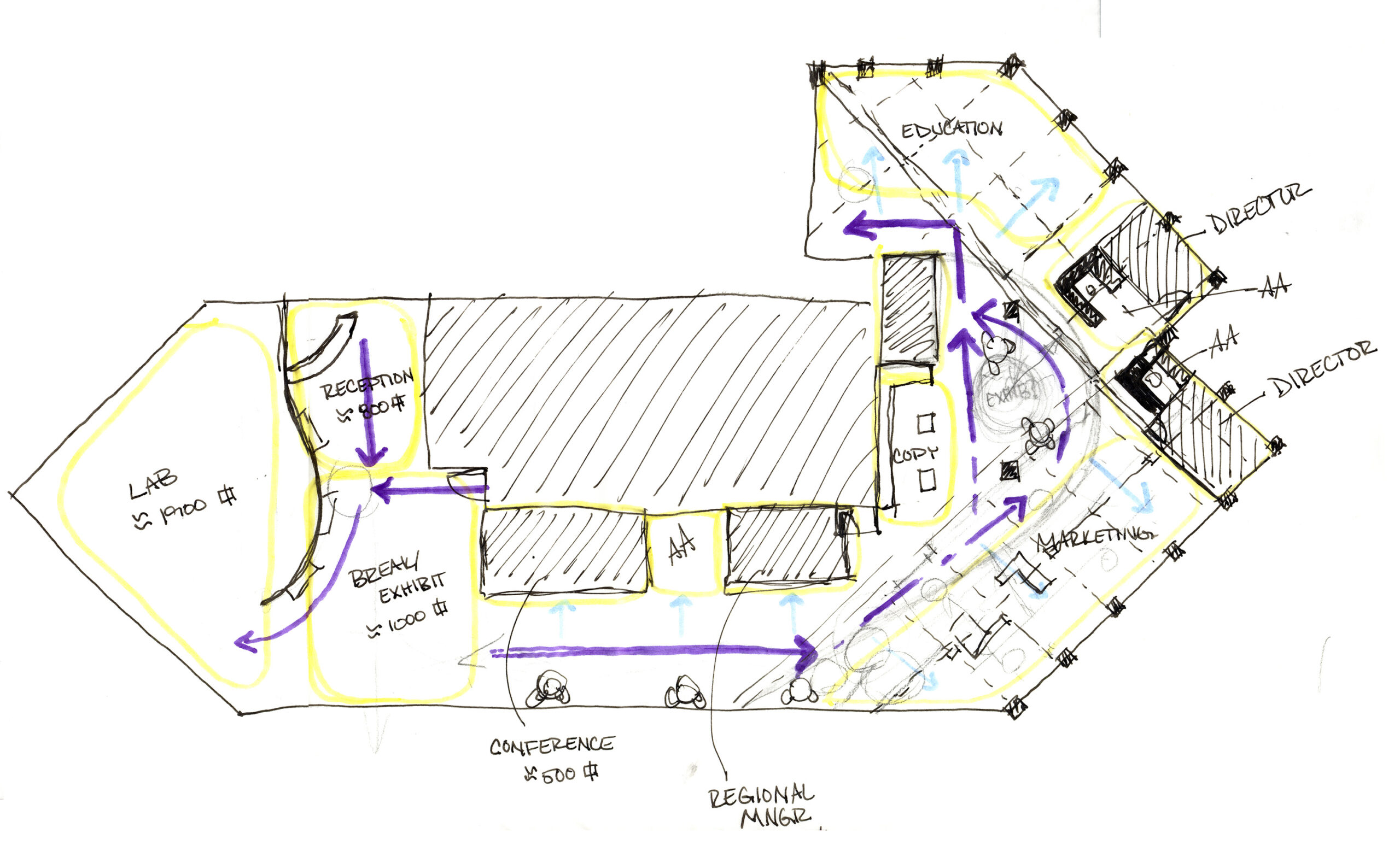 A driving force of the design was to create two nodes of particular interaction within the office. One is designed specifically for public interactions and guests while the other focuses on inter-department collaboration necessary for a functional office. The use of daylight is emphasized to promote a focus on sustainability and worker productivity