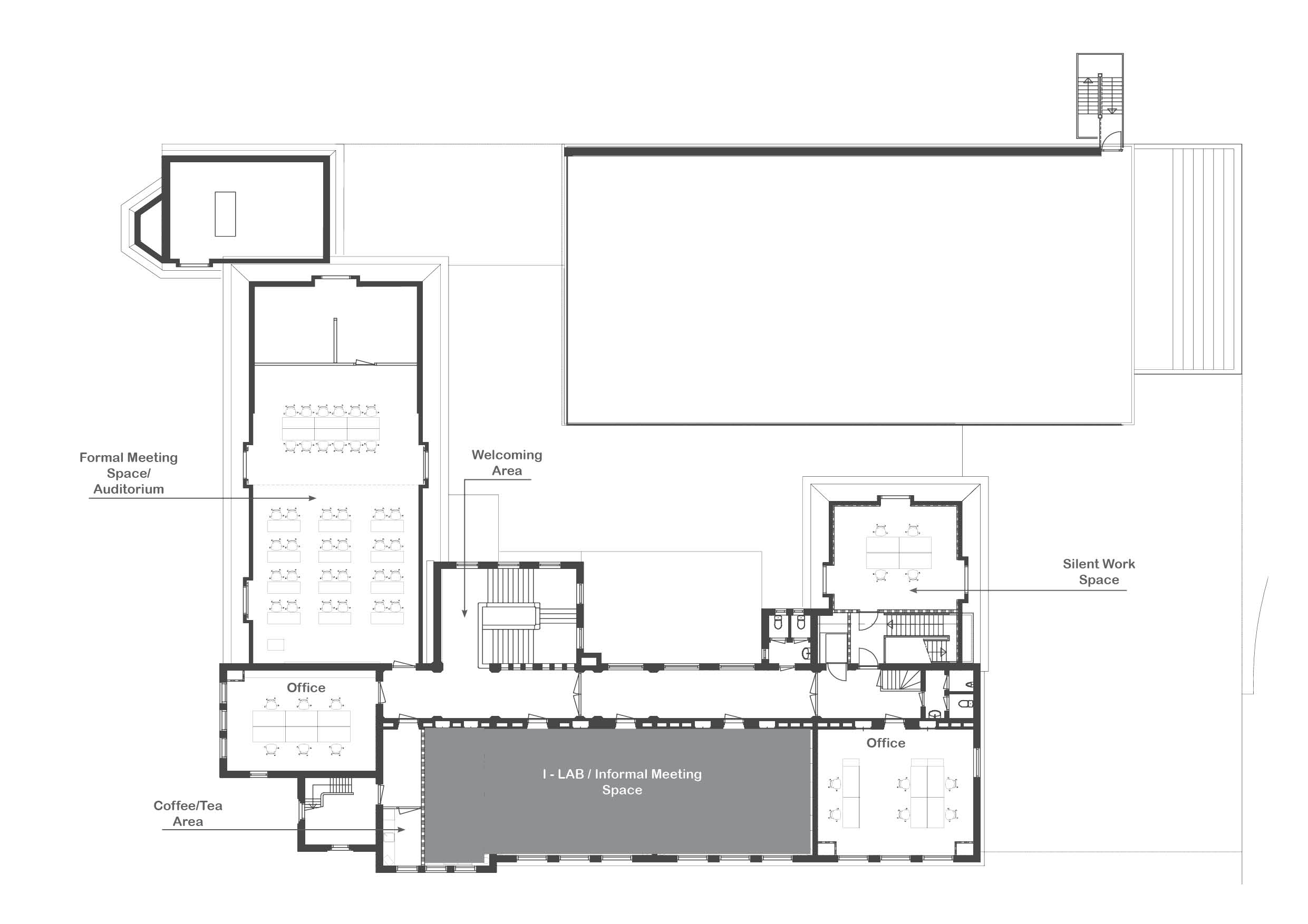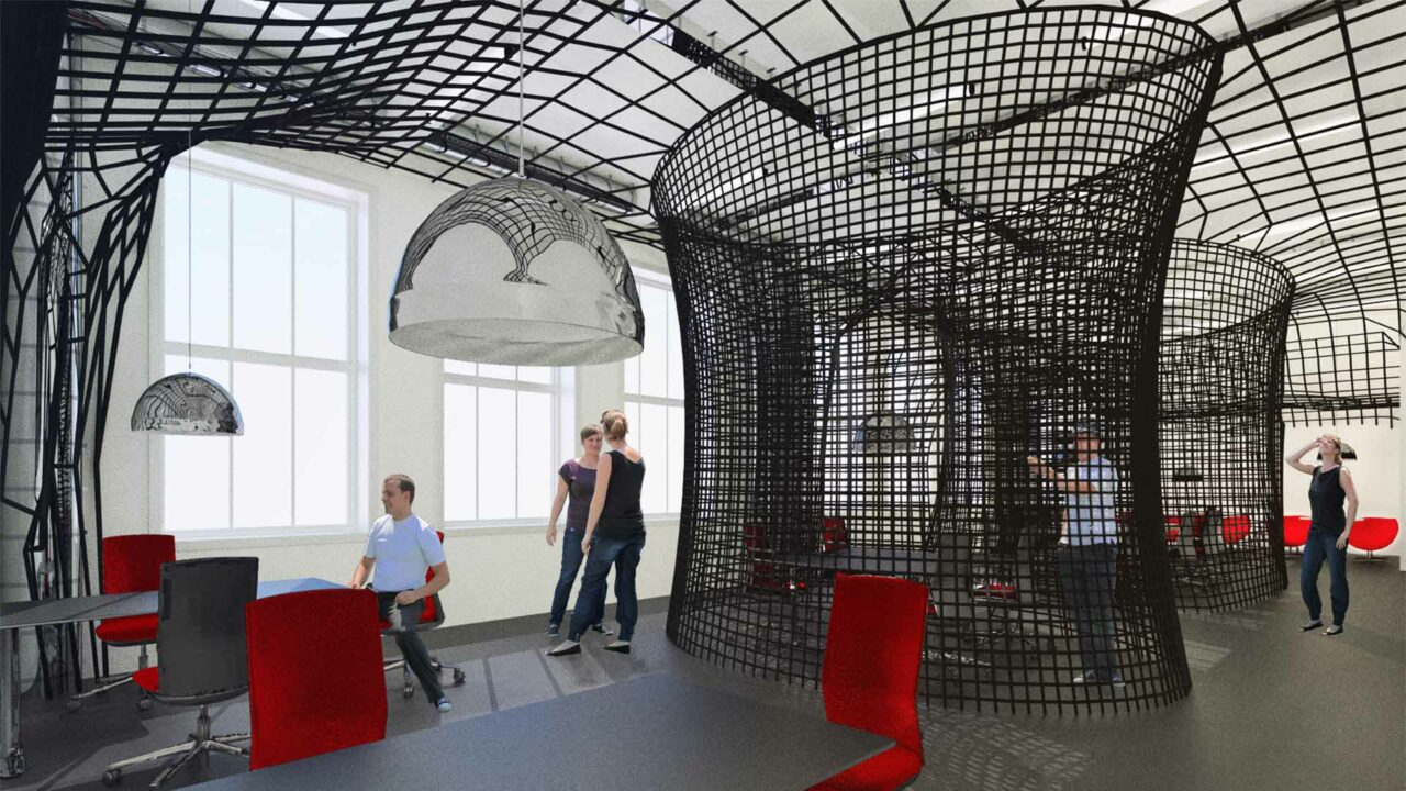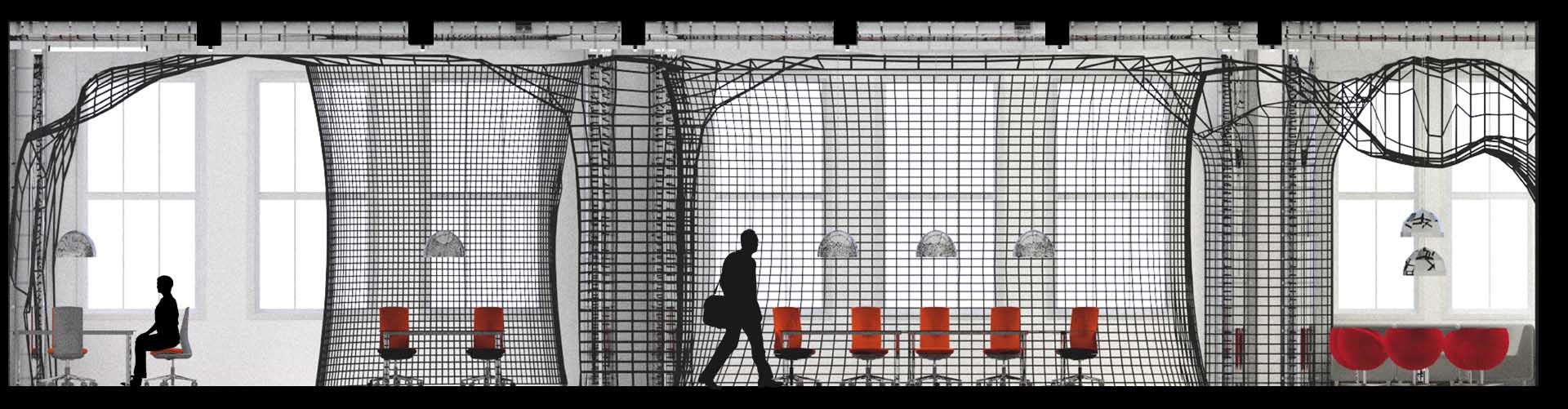 The goal of design was to create a new vision for the IOI’s research facilities in the historical building of the Coolhaven area. IOI, the Institute for Applied Research of Rotterdam University, consists of 6 different departments, combining the education with research, and ensuring a maximum synergy between various sectors of expertise. The main objective was to create flexible working spaces that could adjust to different users’ needs to divide a space or to emphasize a collaboration between users. The flexibility of bike ropes emphasizes the concept of temporality inside a building, giving multiple possibilities to organize a single space in different directions